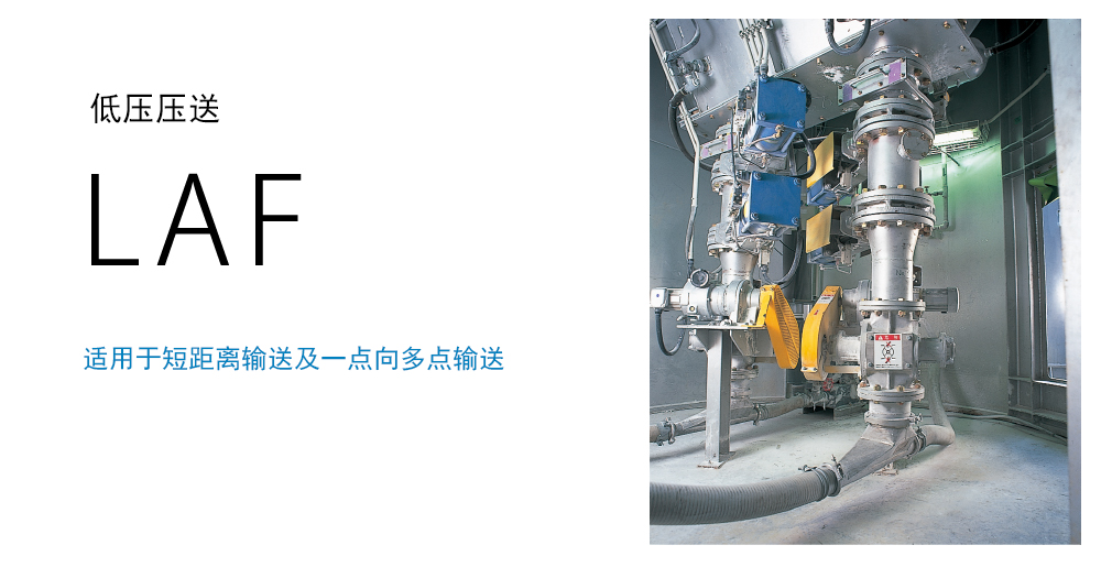 主要适用的粉体 膨润土、碳酸钙、水泥、石灰、苯二甲酸 通过利用输送气流的动态压力使输送粉体悬浮,以较低的浓度输送。 运输速度比高压压送式(HAF)快,运输风速为20~30m/s。 因为设备构成简单,可以控制导入费用。
