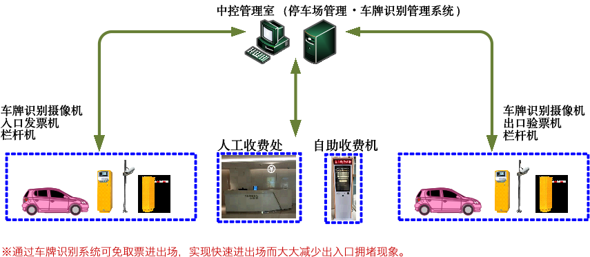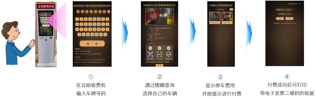 系统特点:车辆通过出入口配备车牌识别系统快速入场与出场。为用户提供多样的缴费方式。如:现金自助缴费,手机APP自助支付。无牌车辆可通过出入口发票,验票机,识别二维码票据信息计费停车。用户可以通过反向寻车系统按照提示路径轻松,快捷的找到自己的爱车。