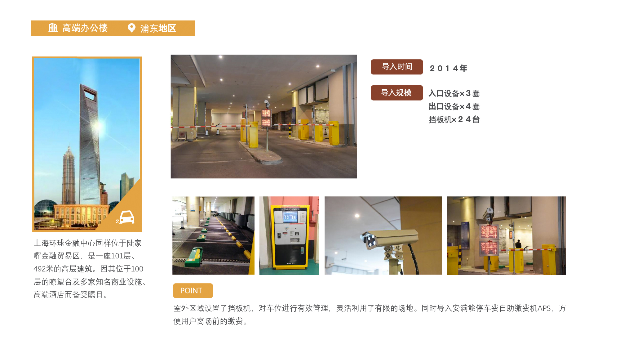 设施概要: 上海环球金融中心位于陆家嘴金融贸易区,是一座101层、492米的高层建筑。因其位于100层的瞭望台及多家知名商业设施、高端酒店而备受瞩目。 停车场概要: 入口设备×3套 出口设备×4套 挡板机×24台 系统特点:室外区域设置了挡板机,对车位进行有效管理,灵活利用了有限的场地。同时导入胜游亚洲官方网站能停车费自助缴费机APS,方便用户离场前的缴费。