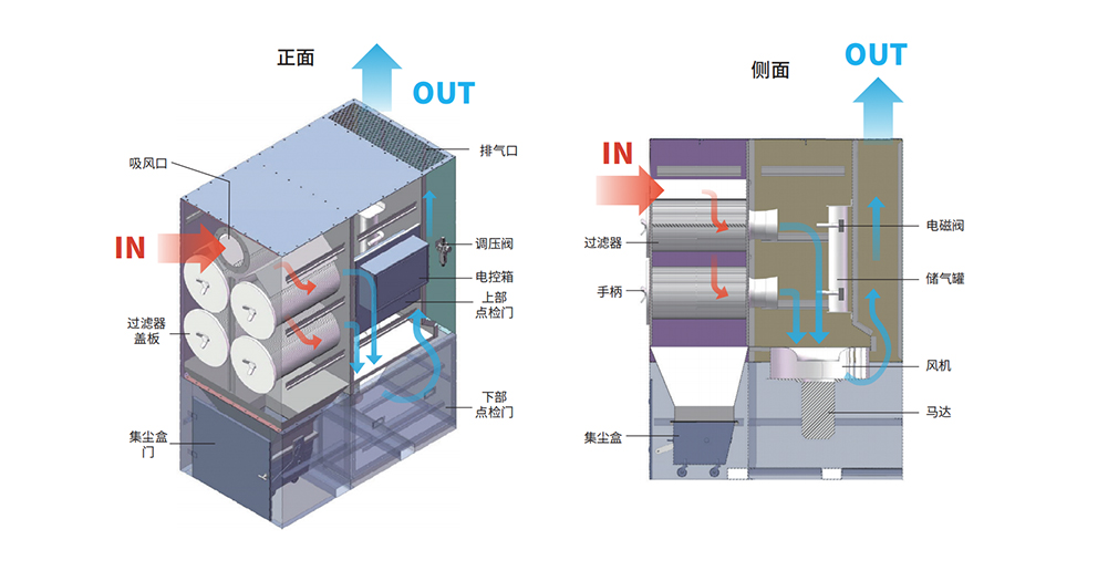 通过触控屏设置反吹条件后,达到设定压差值方进行反吹,提高清灰效率,减少不必要的能耗。